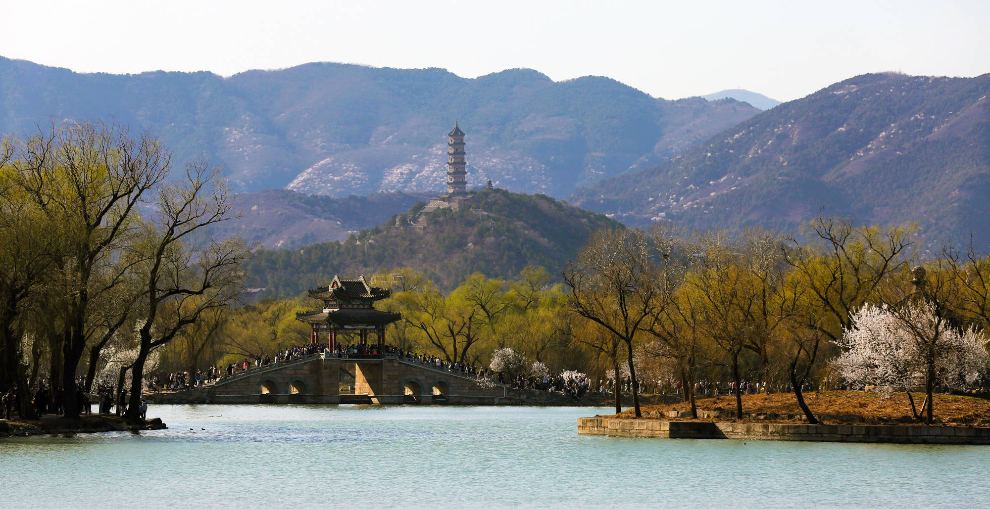 近日,北京颐和园内山桃花等花卉盛开,花红柳绿、亭台楼阁构成一幅春日画卷,吸引众多游客前来踏青游玩。